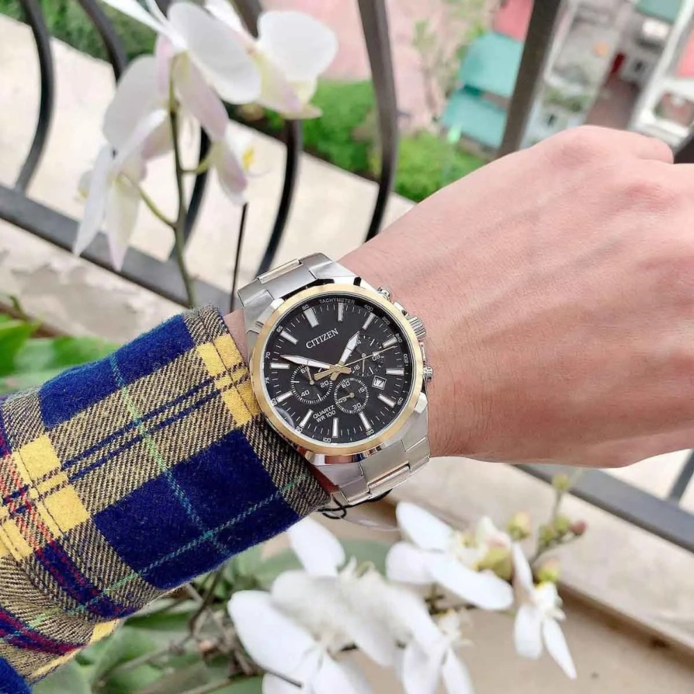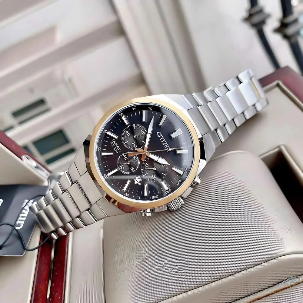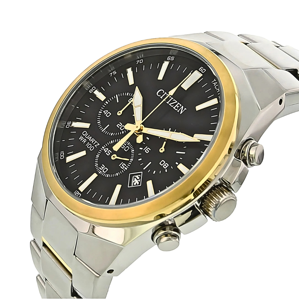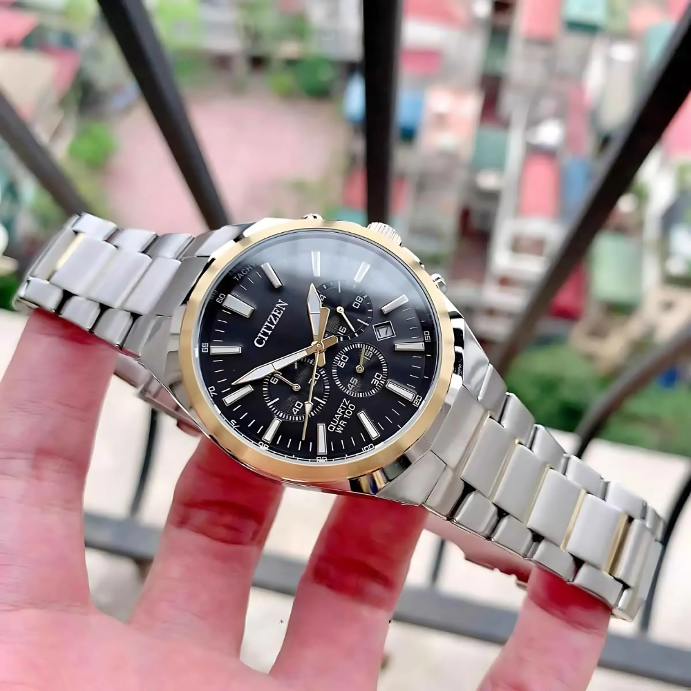 ساعة رجالية أنيقة بطابع رياضي فاخر، تجمع بين الميناء الأسود الجذاب والتفاصيل الذهبية الراقية. تصميمها العصري المزوّد بوظيفة الكرونوغراف يمنحك الدقة والعملية، بينما يضفي السوار المعدني بلونيه الفضي والذهبي حضورًا مميزًا يناسب مختلف الإطلالات الرسمية واليومية ✨