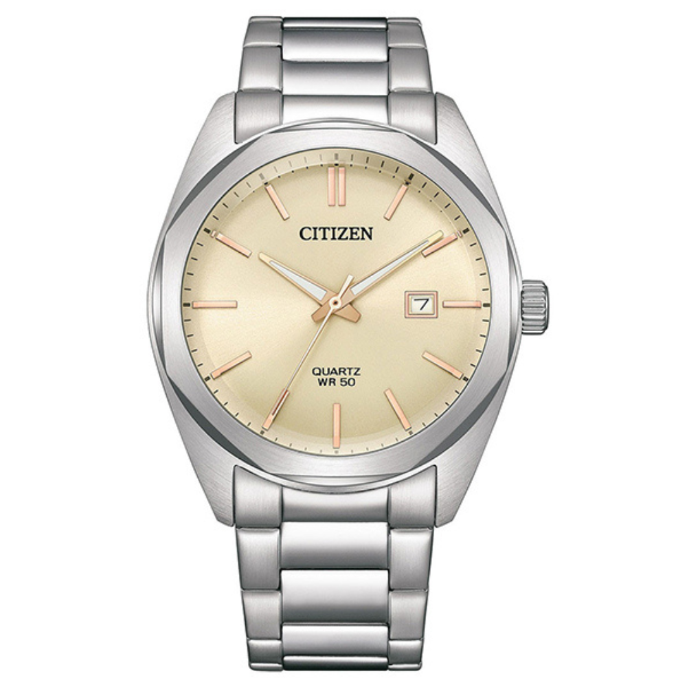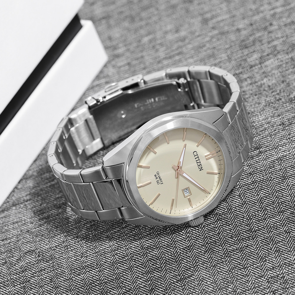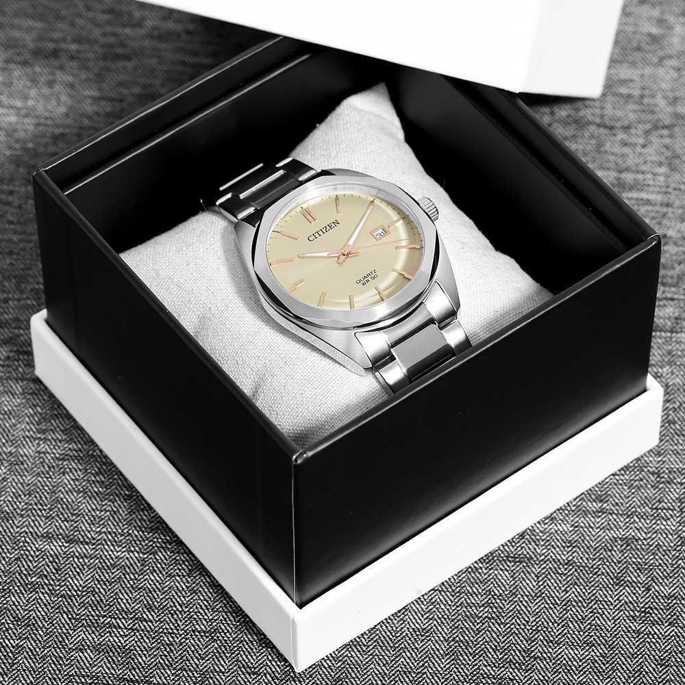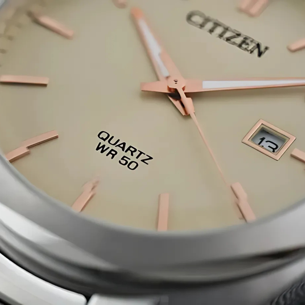 ساعة سيتيزن كلاسيك كوارتز الرجالية تجمع بين مظهر ناعم وأداء عملي يومي. يتميز الميناء بالعاج الكلاسيكي مع عقارب بلون الذهب الوردي تبرز بوضوح، والسوار من الستانلس ستيل الفضي يمنحها مظهرًا رسميًا عمليًا متناسقًا في جميع المناسبات✨