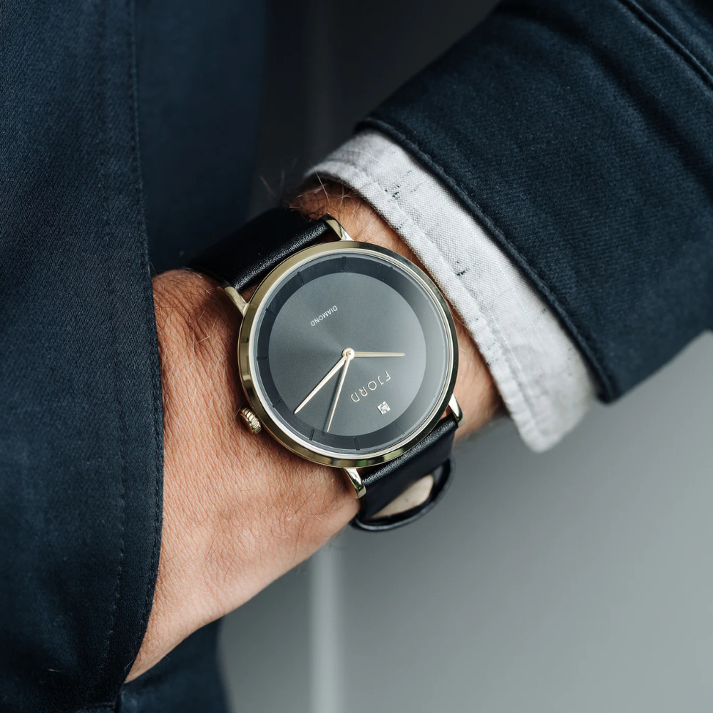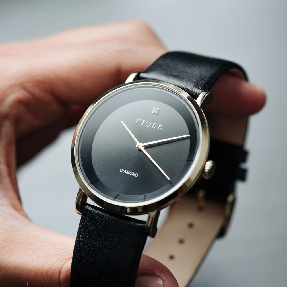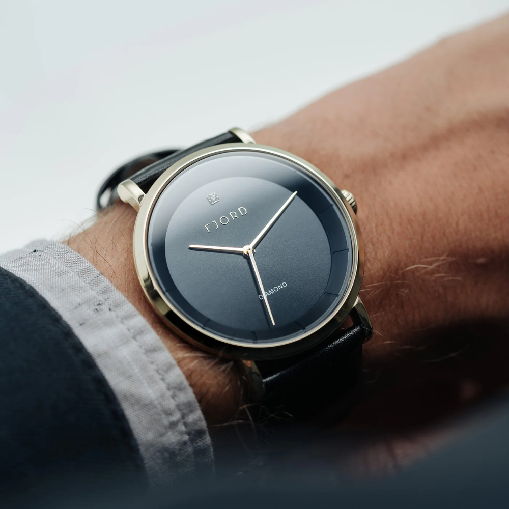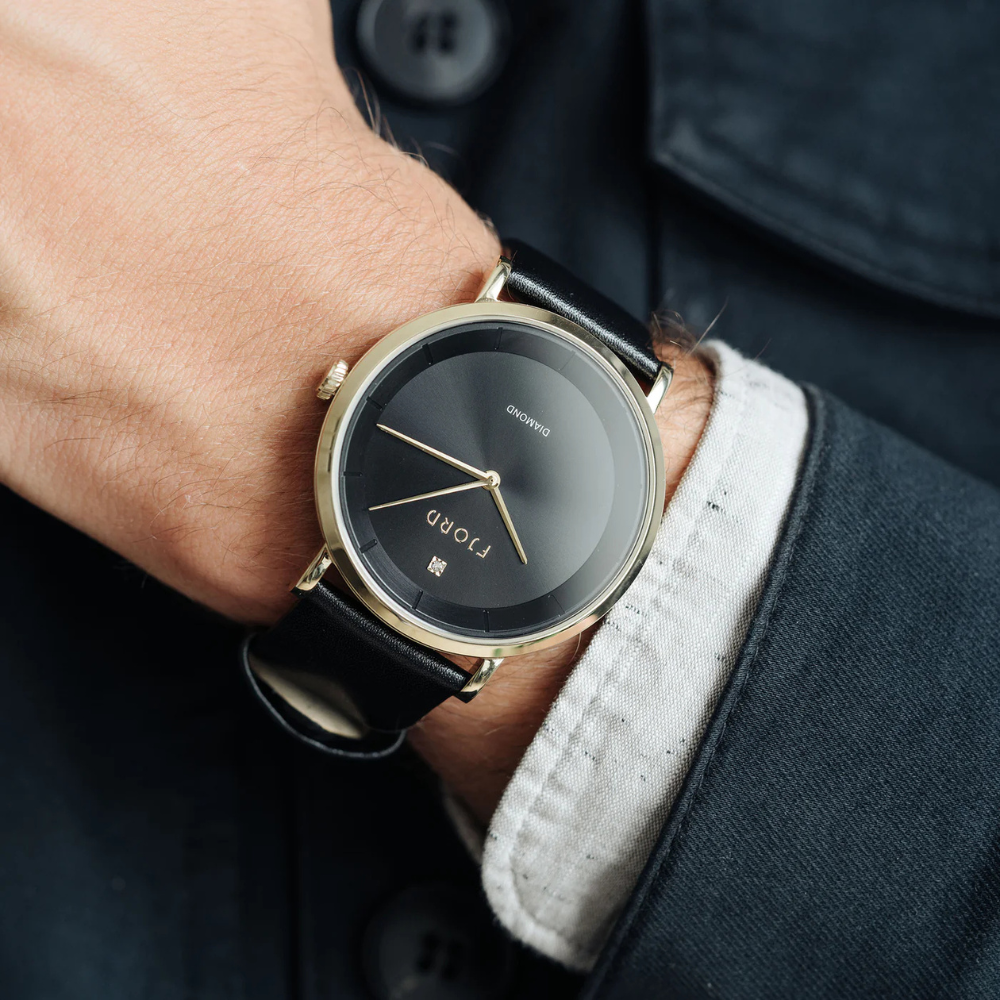 ساعة رجالية من مجموعة جينسن تجمع بين البساطة الإسكندنافية واللمسة الكلاسيكية الراقية. ميناء أسود راقٍ يتوسطه إطار ذهبي ناعم، بينما يمنح السوار الجلدي الأسود توازنًا مثاليًا بين الجدية والأناقة في تصميم عملي يومي🖤