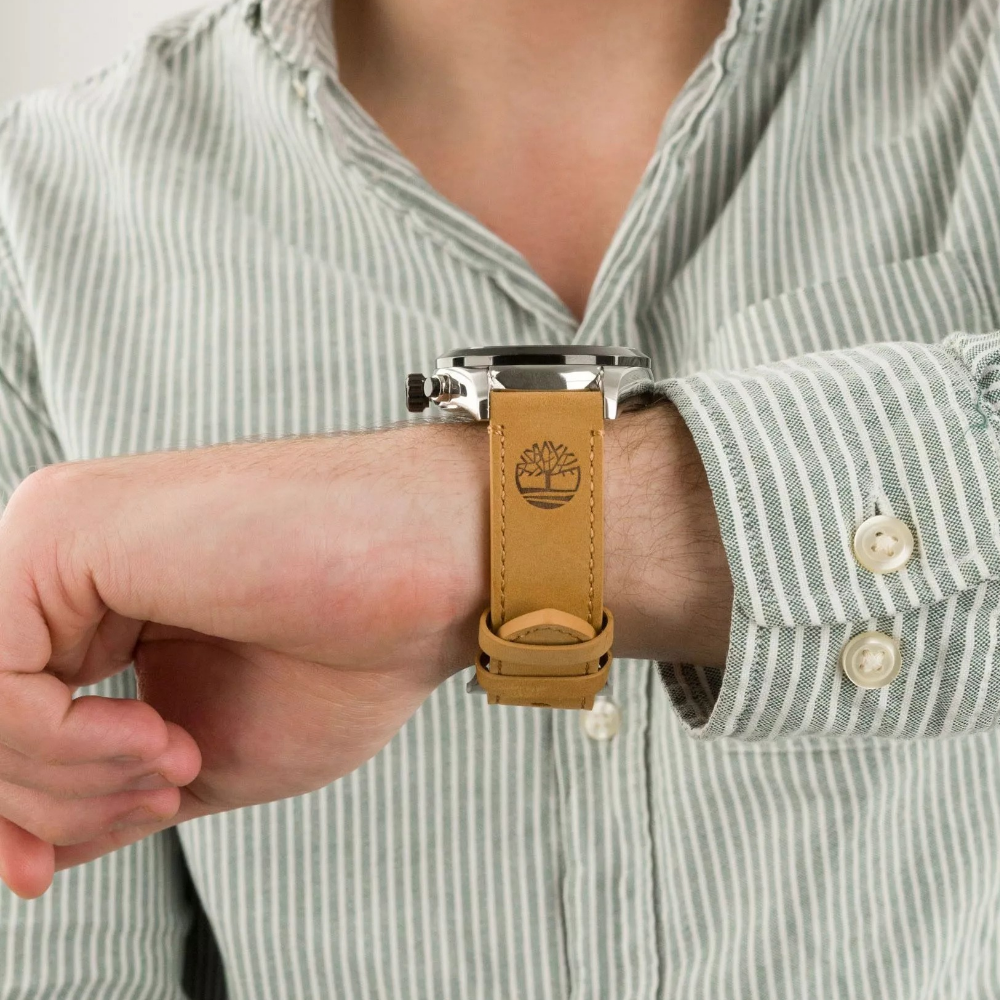 • سوار جلدي بني (عرض 20 ملم): منقوش بشعار تمبرلاند يعطي لمسة فاخرة وراحة في الارتداء.