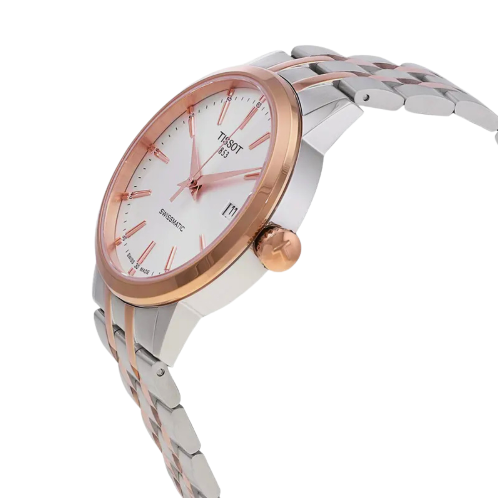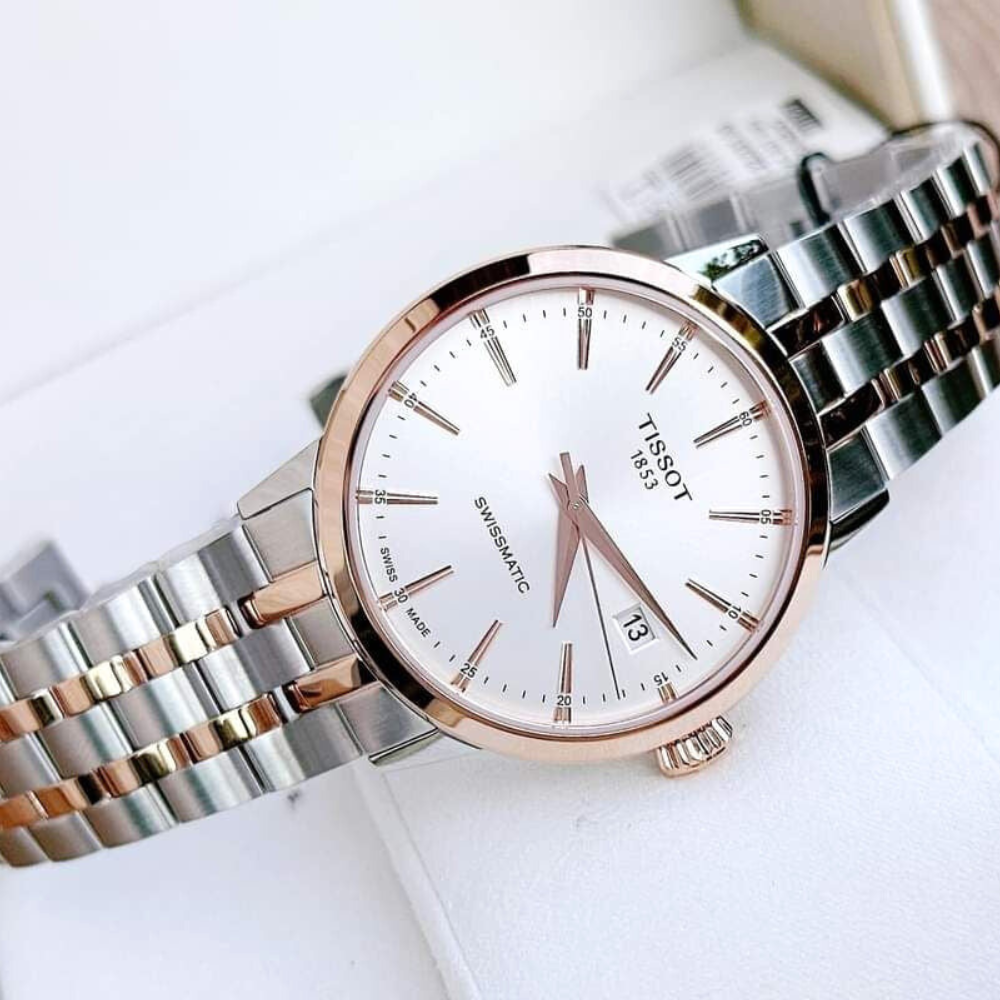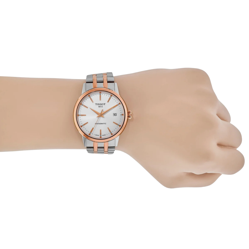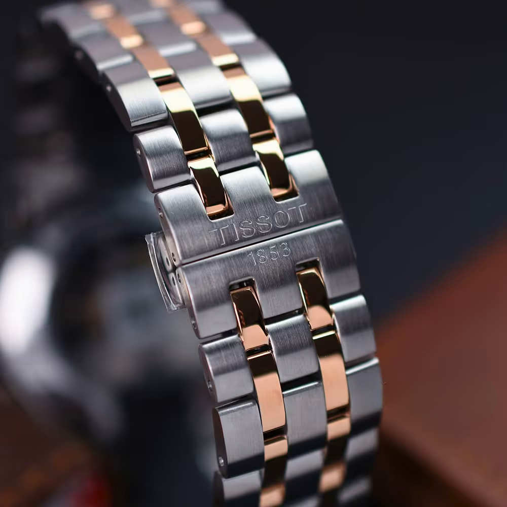ساعة تيسو كلاسيك دريم الرجالية تجمع بين فخامة التصميم السويسري الكلاسيكي ودقة الأداء الميكانيكي، بلمسة راقية من الذهب الوردي. الميناء الفضي البراق يعكس النور بانسيابية، بينما يضفي السوار ثنائي اللون مزيجًا جذّابًا من الأناقة والفخامة. هذه الساعة اختيار مثالي لعشّاق الذوق الرفيع والتفاصيل الدقيقة ✨