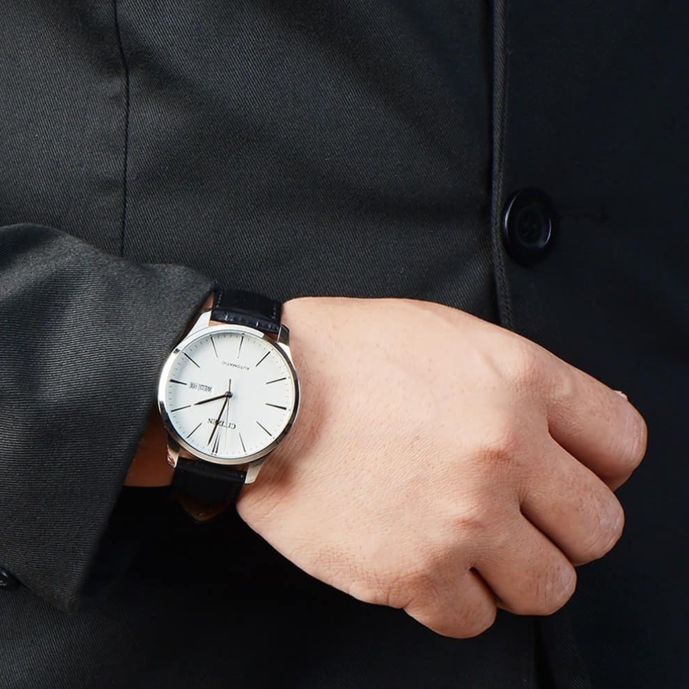 ساعة سيتيزن الأوتوماتيكية الرجالية بتصميم كلاسيكي يجمع بين البساطة والأناقة، مثالية لمن يفضلون الأسلوب التقليدي بلمسة عصرية. يبرز ميناؤها الأبيض النقي مع العقارب والمؤشرات الفضية بشكل أنيق، فيما يمنحها السوار الجلدي البني مظهرًا راقٍ يناسب مختلف المناسبات🤍