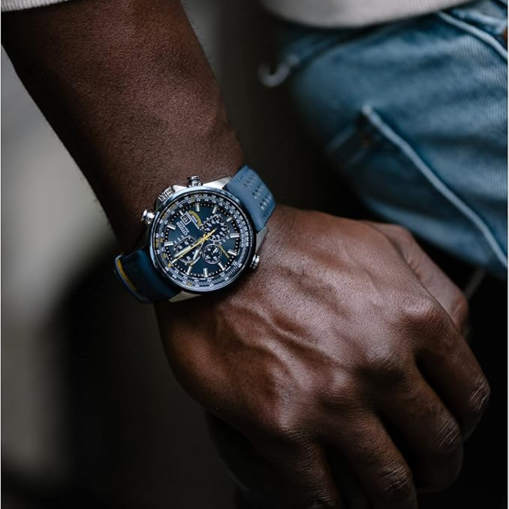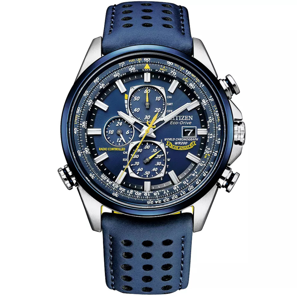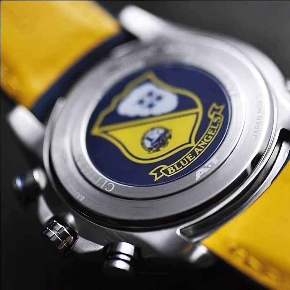 ساعة سيتيزن بلو آنجلز الرجالية بتقنية إيكو درايف تجمع بين التكنولوجيا المتقدمة وروح الطيران، في تصميم مستوحى من فريق بلو آنجلز الشهير. يتميز الميناء الأزرق بتفاصيل دقيقة وأنيقة، بينما يعكس السوار الجلدي المتناسق لمسات مستوحاة من بدلات الطيارين. ساعة مثالية لعشّاق الدقة والمغامرة، تجمع بين الفخامة والأداء العالي💙