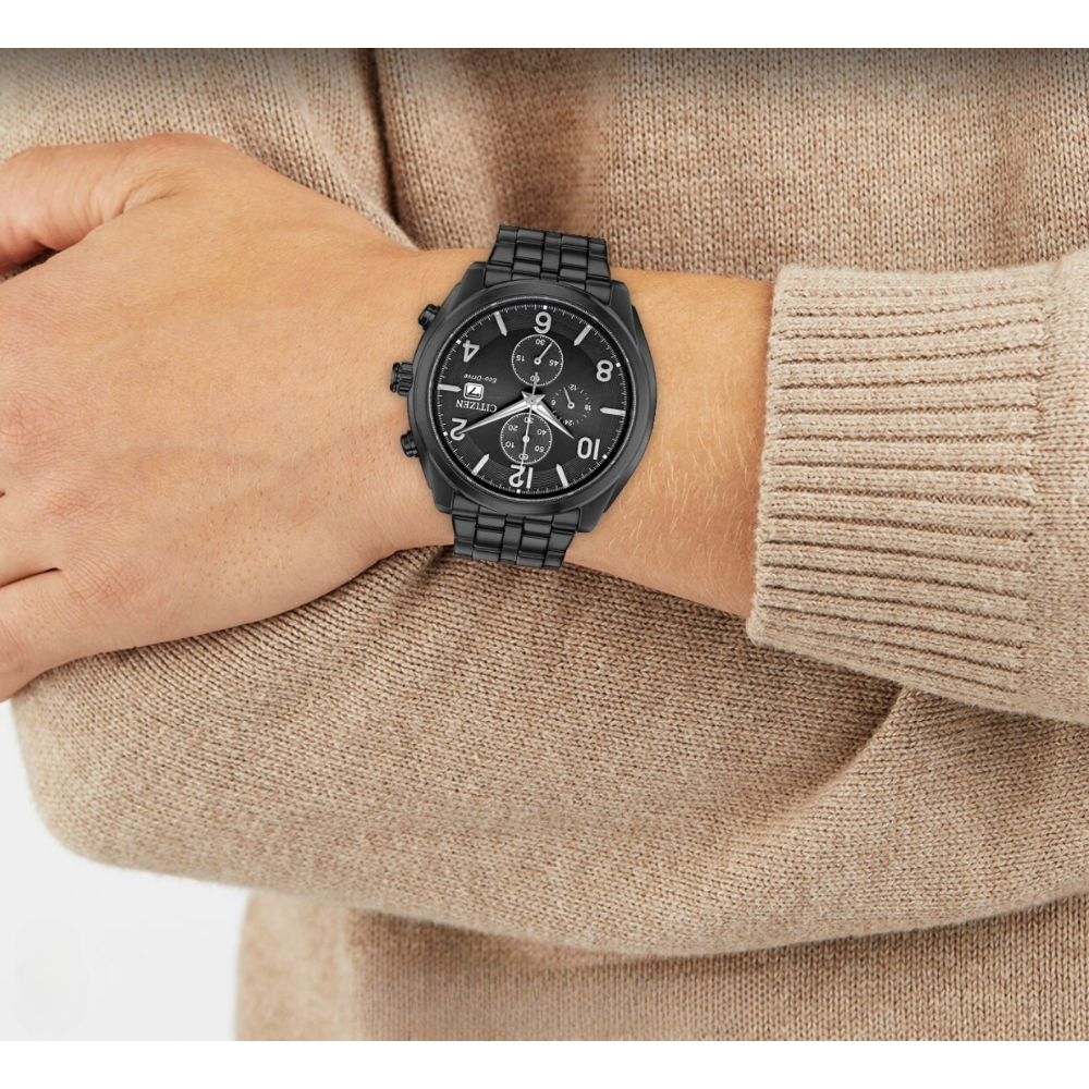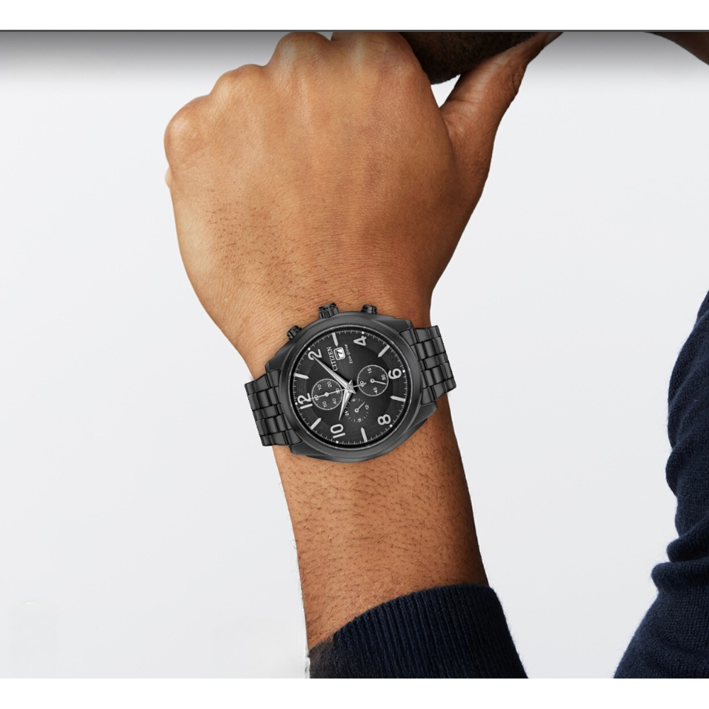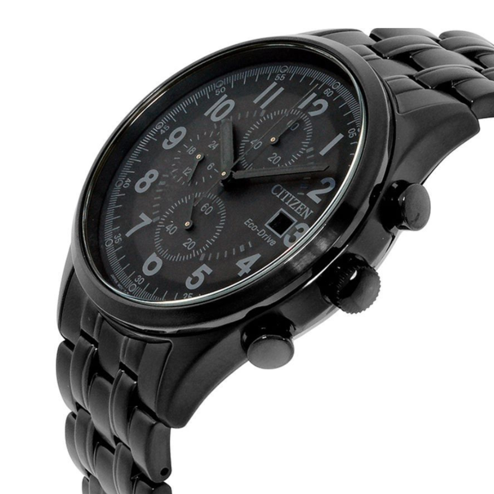 ساعة سيتيزن شاندلر إيكو درايف الرجالية تجمع بين الأناقة والأداء المتفوق. الهيكل المصنوع من الفولاذ المقاوم للصدأ باللون الأسود بقطر 42 ملم وسُمك 12 ملم يعطيها مظهرًا عصريًا وجريئًا. الميناء الأسود المزود بعقارب مضيئة يضمن لك قراءة الوقت بسهولة في أي وقت. تحتوي أيضًا على كرونوغراف بدقة 1/5 ثانية لقياس الوقت حتى 60 دقيقة، مع عرض 12/24 ساعة وتاريخ عند الساعة 3 يمنحك طريقة عملية وسهلة لمتابعة الوقت, السوار المعدني بعرض 22 ملم يوفر راحة وثباتًا على المعصم💖
