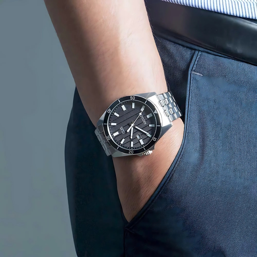 ساعة رجالية أنيقة تجمع بين العملية والمظهر العصري. يتميز ميناؤها الأسود بتصميم مميز وواضح، مع عقارب ومؤشرات مضيئة تمنحها حضورًا راقيًا وتضمن قراءة مريحة في أي وقت، فيما يكمل السوار المعدني الفضي إطلالتها المتوازنة🖤