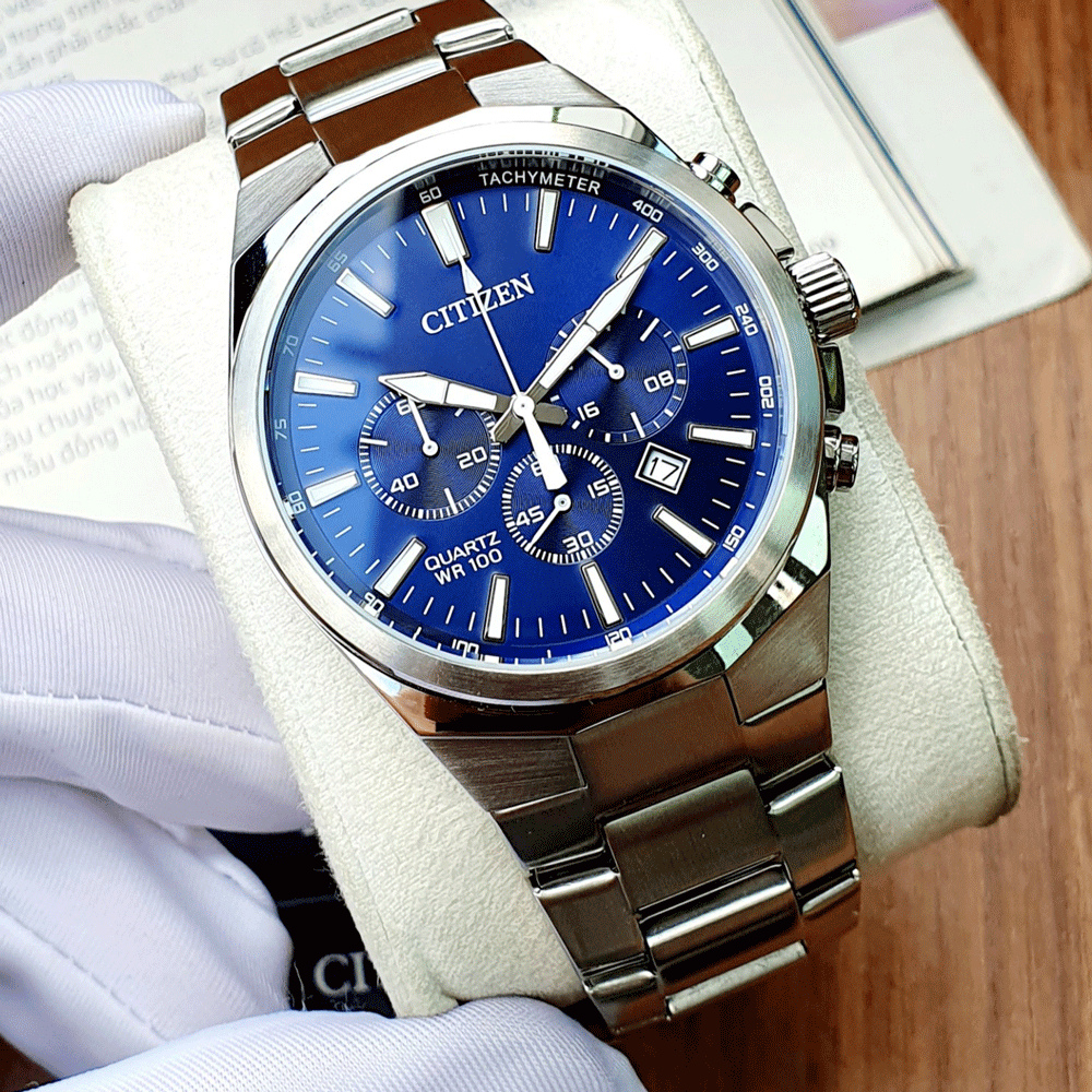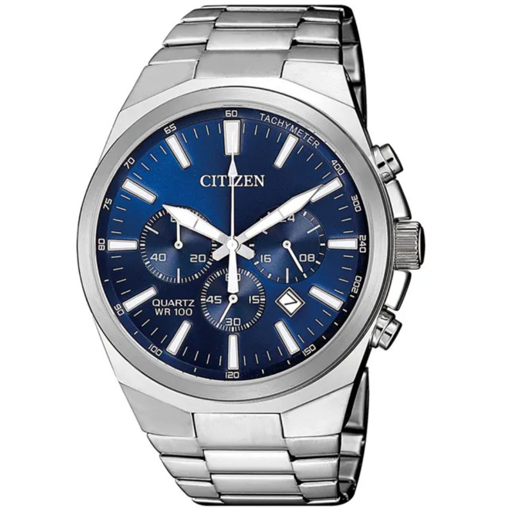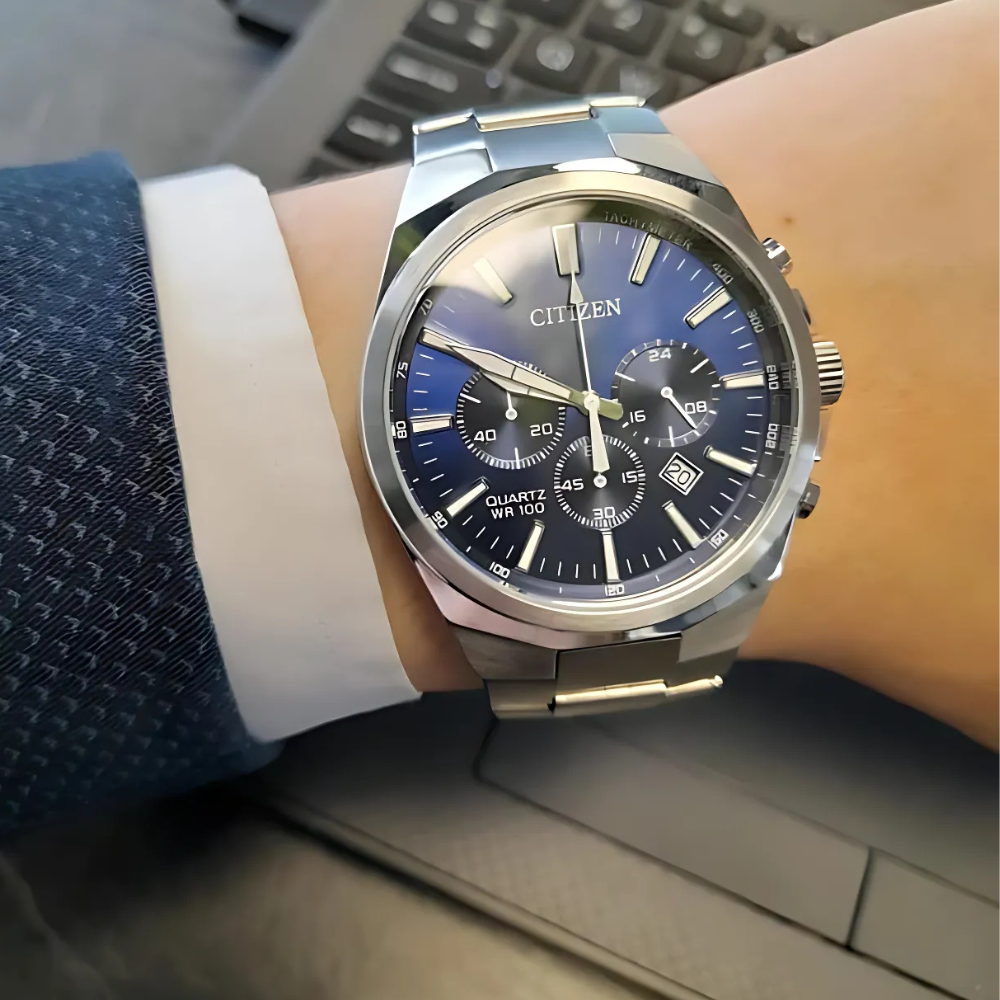 ساعة سيتيزن كرونوغراف كوارتز رجالية بطابع رياضي متطور، تجمع بين الحضور اللافت والدقة العملية. يبرز الميناء الأزرق الغني بالتفاصيل مع وظائف الكرونوغراف التي تمنحك تحكمًا مثاليًا بالوقت، فيما يضيف السوار المعدني الفضي المصقول لمسة متينة وأسلوبًا عصريًا يناسب مختلف الإطلالات💙