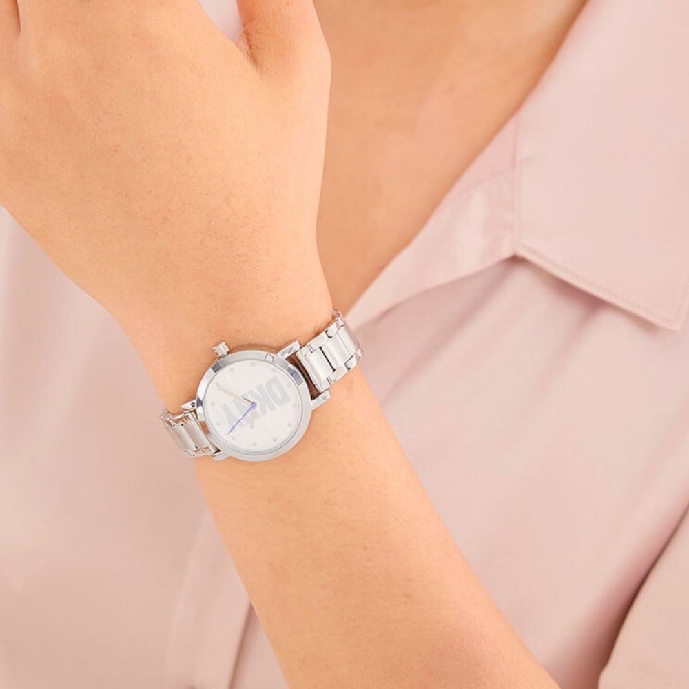 - ميناء فضي بنقش DKNY: يضيف لمسة عصرية ويُسهّل قراءة الوقت.