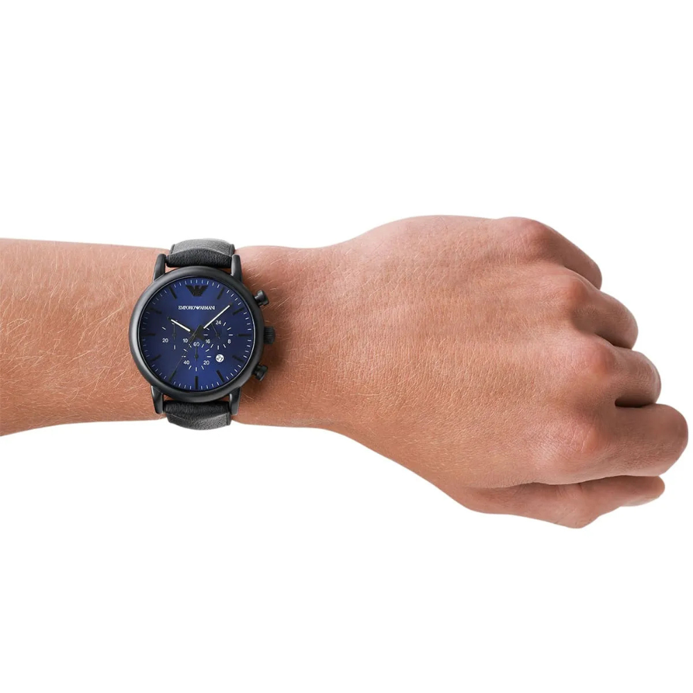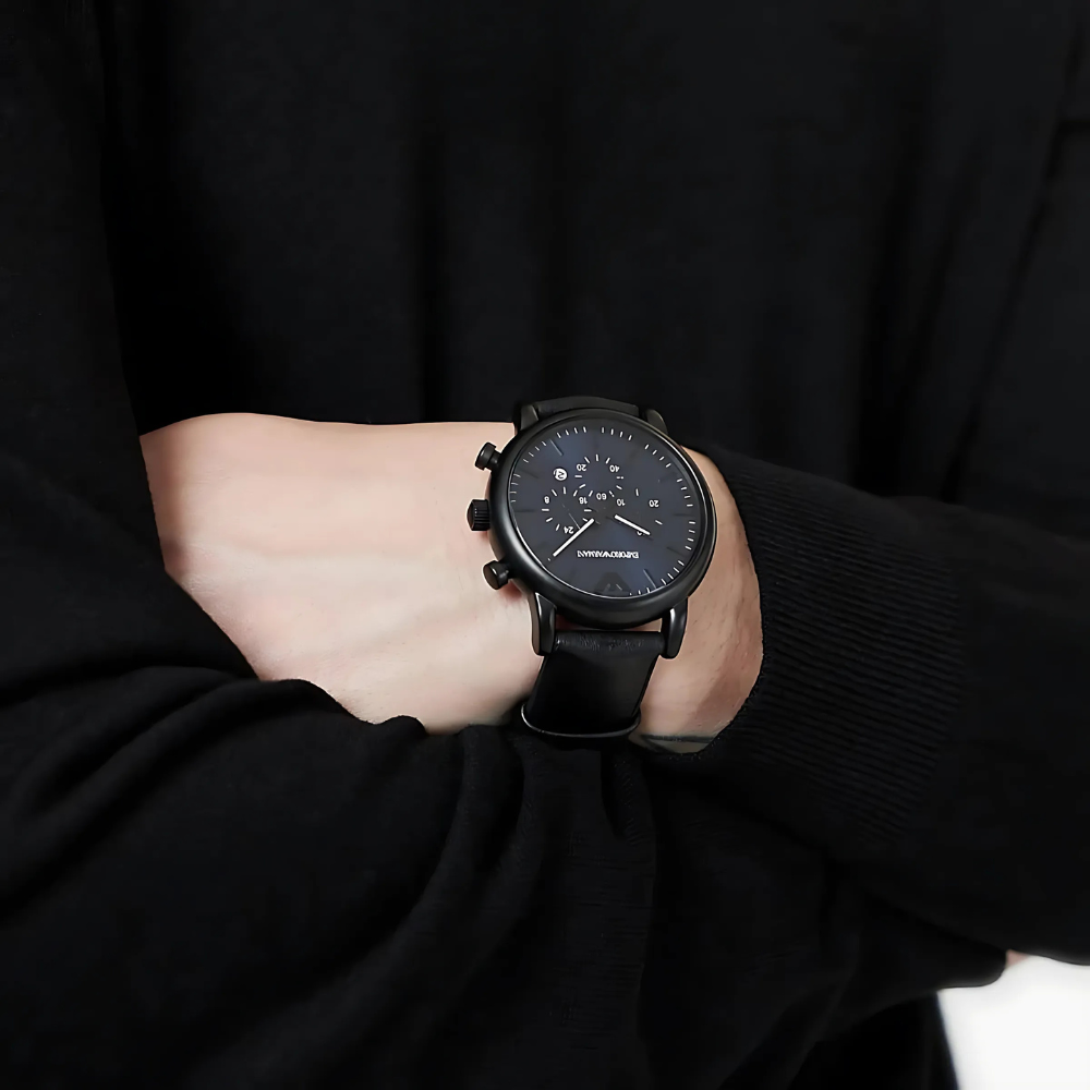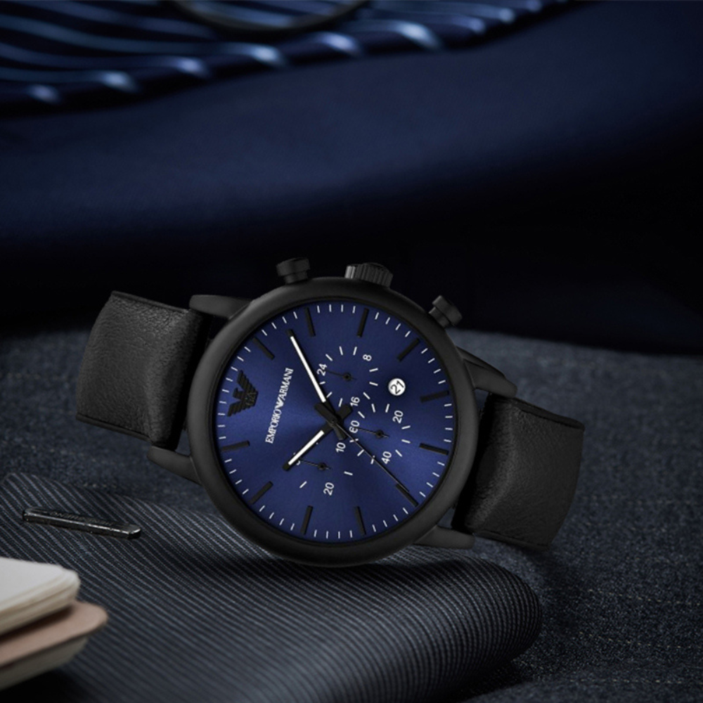 ساعة إمبوريو أرماني الرجالية تجمع بين الكلاسيكية الأنيقة والوظائف العملية. ميناؤها الأزرق اللافت مع عدّادات الكرونوغراف يمنحها طابعًا رياضيًا راقيًا، بينما يكمل السوار الجلدي الأسود المظهر بلمسة من الفخامة تناسب الرجل العصري الباحث عن التميز في إطلالته💙