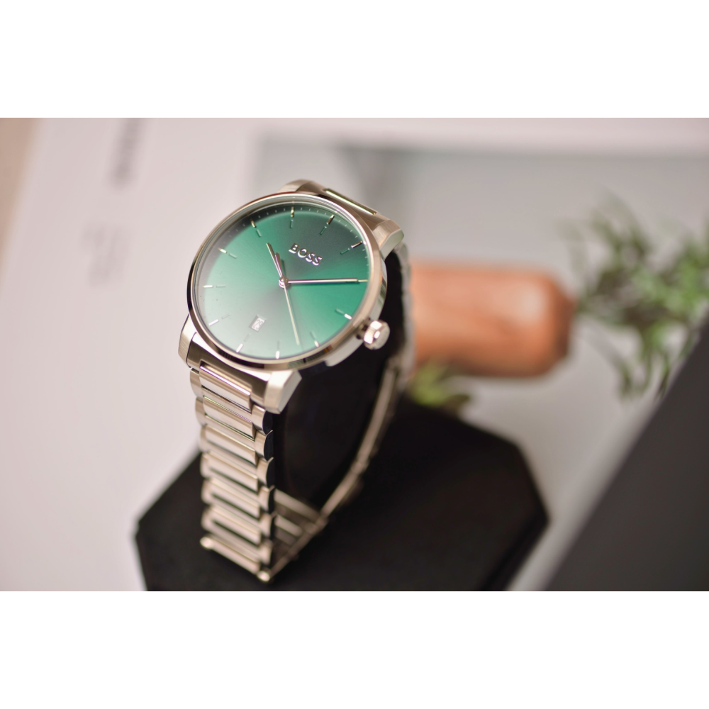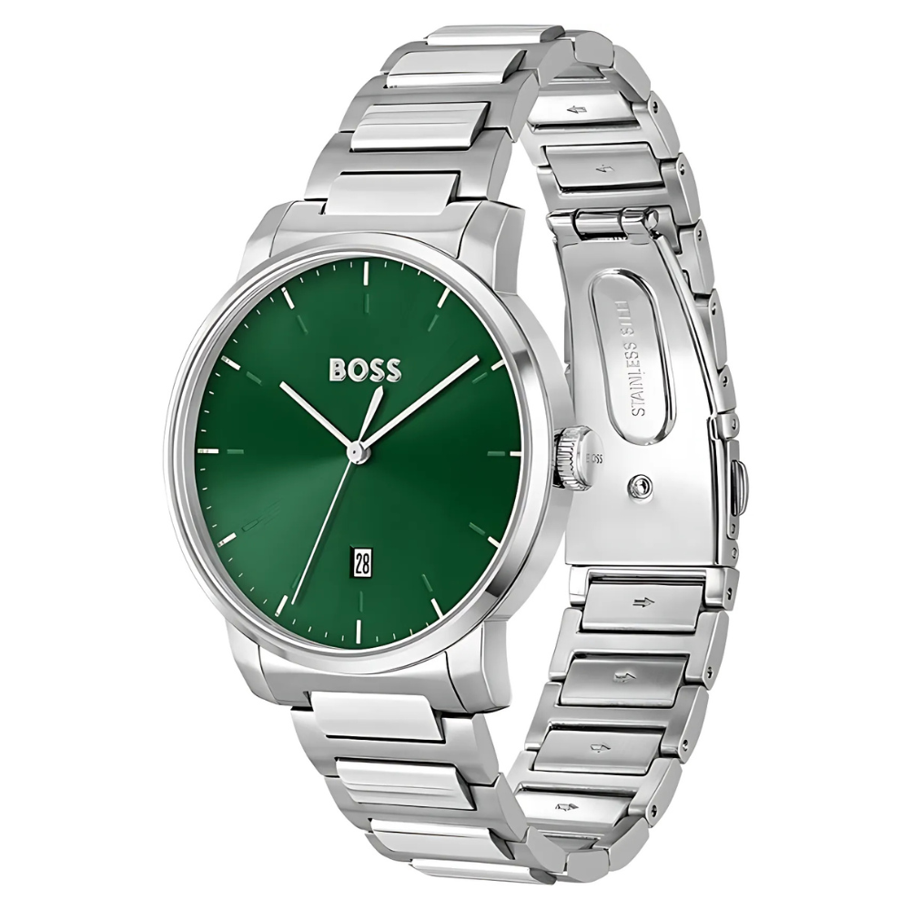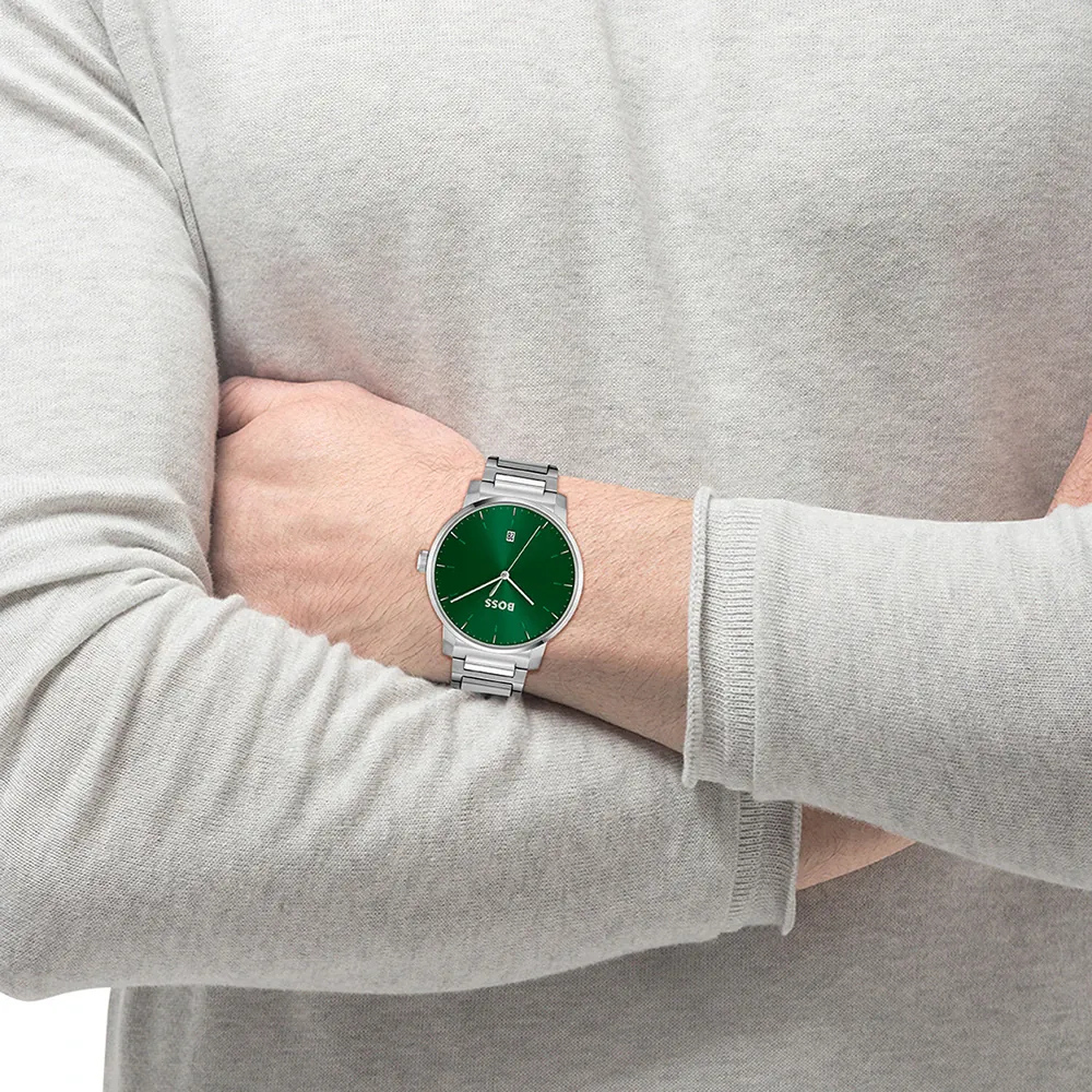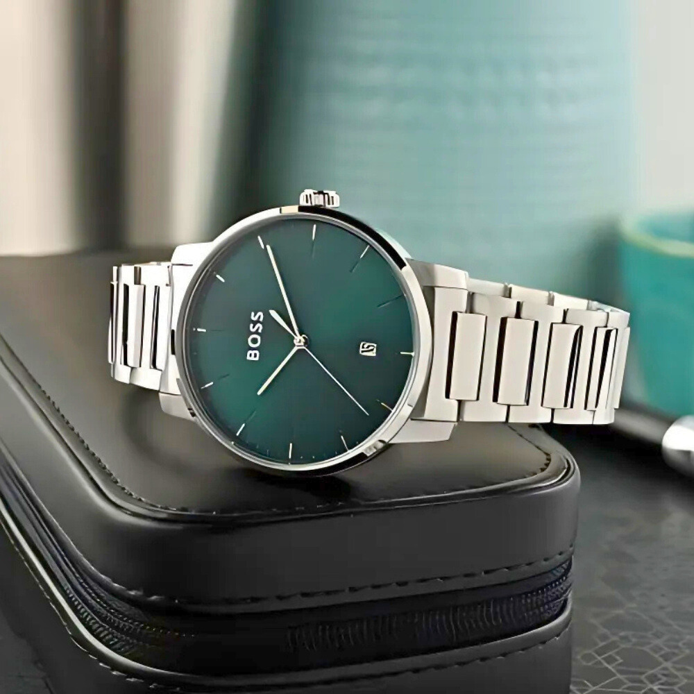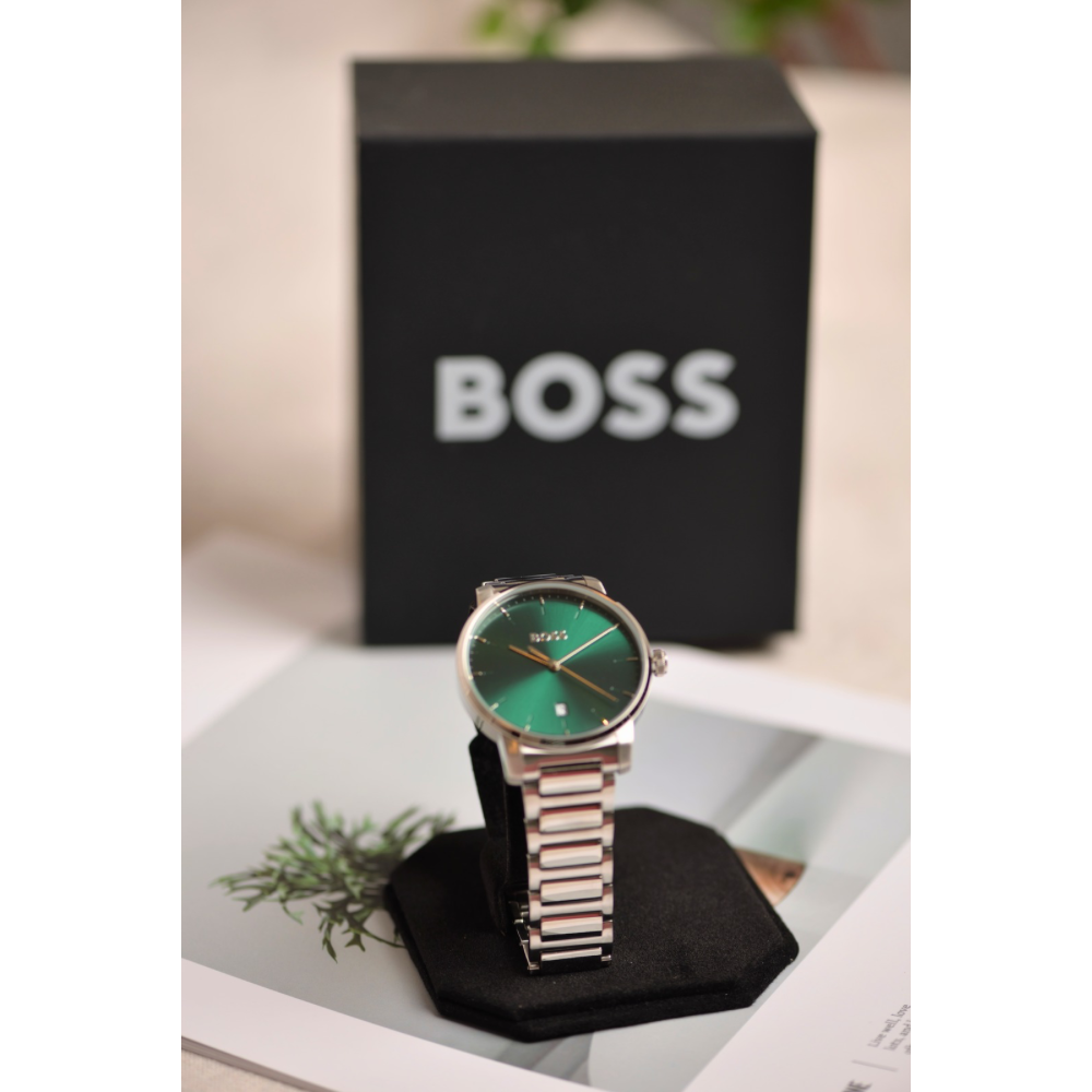 ساعة هوغو بوس أمباسيدر كوارتز الرجالية بتصميم أنيق وعصري، تجمع بين الدقة والفخامة. تأتي بـميناء أخضر جذاب مزوّد بمؤشرات وعقارب فضية لعرض الوقت بوضوح، بالإضافة إلى نافذة عرض التاريخ لتسهيل متابعة مواعيدك اليومية. تم تصميم الهيكل من الستانلس ستيل الفضي عالي الجودة بقطر 42 ملم وسماكة 10 ملم ليمنح الساعة مظهرًا متوازنًا وأنيقًا💚
