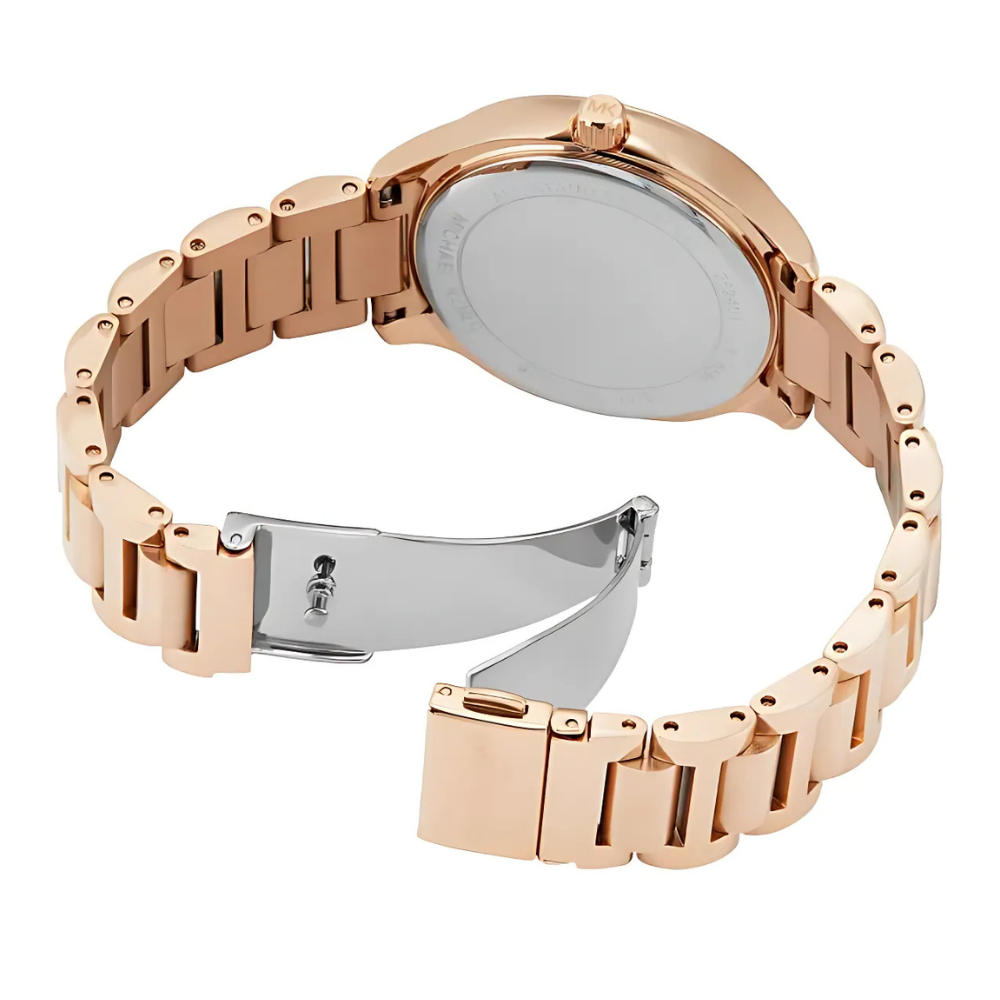 - سوار معدني بلون ذهبي وردي بعرض 18 مم: مزوّد بإبزيم قابل للطي مع زر أمان.