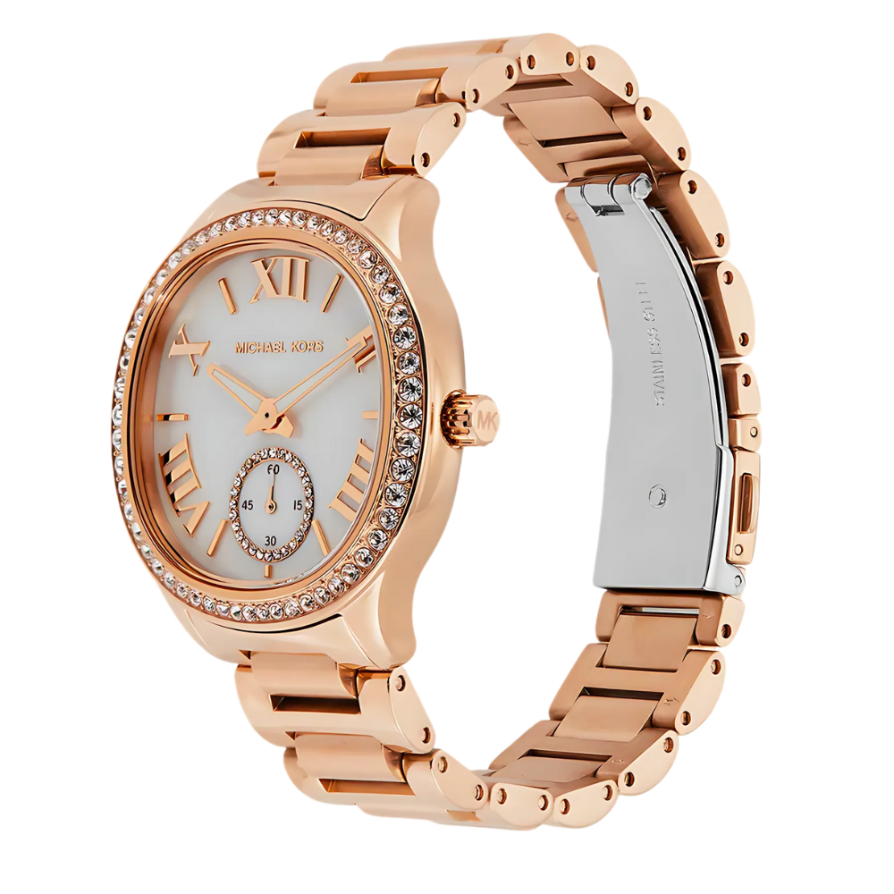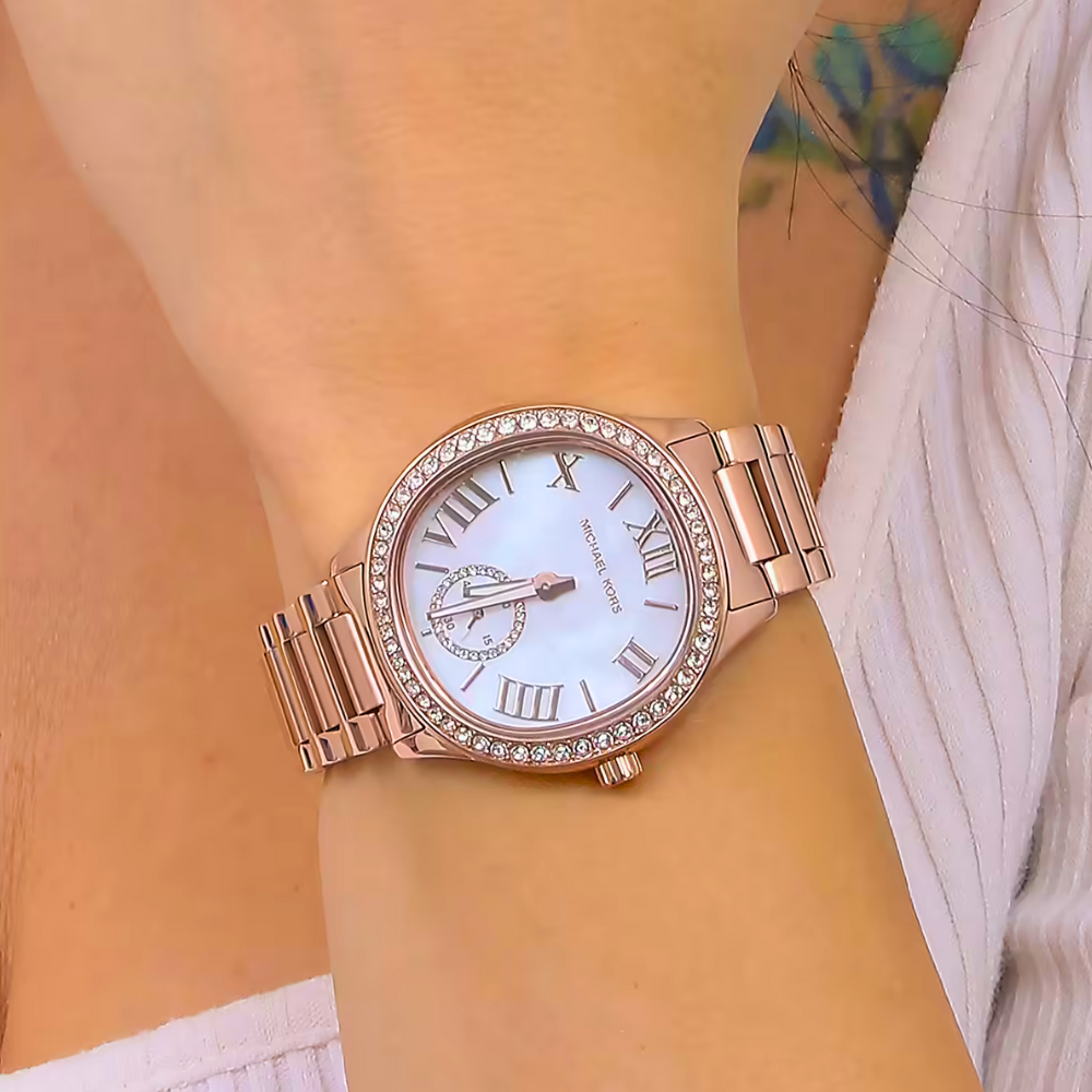 تألّقي بإطلالة تجمع بين الأنوثة الراقية والتفاصيل العصرية مع ساعة مايكل كورس ساج النسائية. تتميز هذه الساعة بميناء مصنوع من عرق اللؤلؤ الأبيض، محاط بإطار مرصّع بكريستالات براقة، وسوار معدني بلون ذهبي وردي يمنحك لمسة فاخرة تناسب جميع المناسبات✨