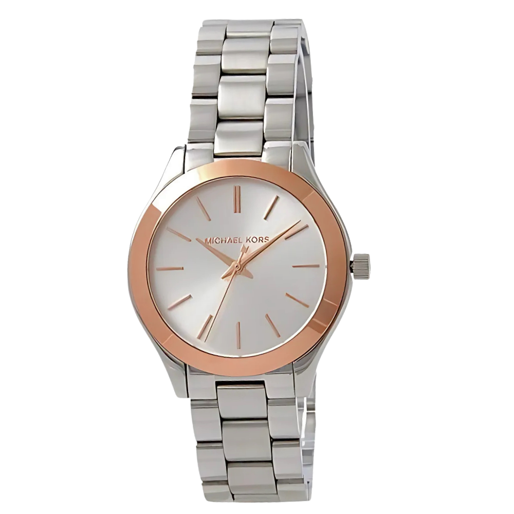 ساعة مايكل كورس ميني سليم رنواي كوارتز نسائية تتميز بتصميم أنيق يجمع بين البساطة والفخامة، مع مزيج من اللونين الفضي والذهبي الوردي، مما يجعلها إضافة مثالية لإطلالتك اليومية أو الرسمية✨