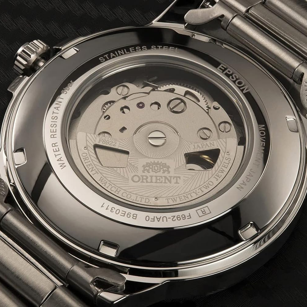 ساعة أورينت الأوتوماتيكية الرجالية بتصميم رياضي أنيق يوازن بين الأداء العملي والجاذبية البصرية. تتميز بميناء أسود أنيق وعلبة ستانلس ستيل مصقولة، مما يمنحها مظهرًا قويًا يلائم الإطلالات اليومية والمغامرات على حدٍ سواء✨
