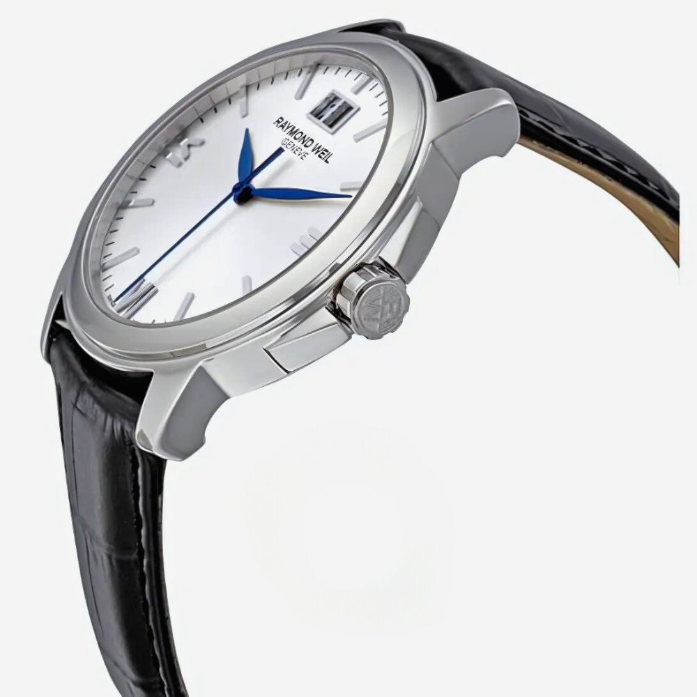 ساعة رايموند ويل كوميرس روت من مجموعة “تراديشن” تتميز بتصميم كلاسيكي يعكس الذوق الرفيع 👌قطر هيكلها الفولاذي 39 ملم وسمكة 9 ملم يمنحها مظهراً متوازناً على المعصم. الميناء الفضي مزود بعقارب زرقاء ومؤشرات رومانية أنيقة، مع نافذة تاريخ عند الساعة 12.