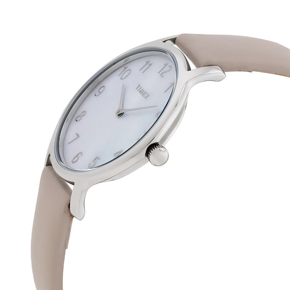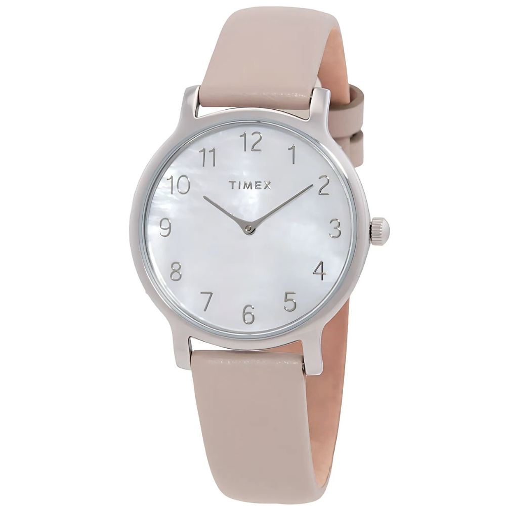 ساعة تايمكس متروبوليتان النسائية تجمع بين الأناقة العصرية ولمسة الفخامة الكلاسيكية. ميناؤها المصنوع من عرق اللؤلؤ يمنحها لمعانًا أنثويًا مميزًا، فيما يكمل السوار الجلدي الوردي الناعم إطلالتها الراقية لتكون مثالية للإطلالات اليومية والمناسبات الخاصة✨