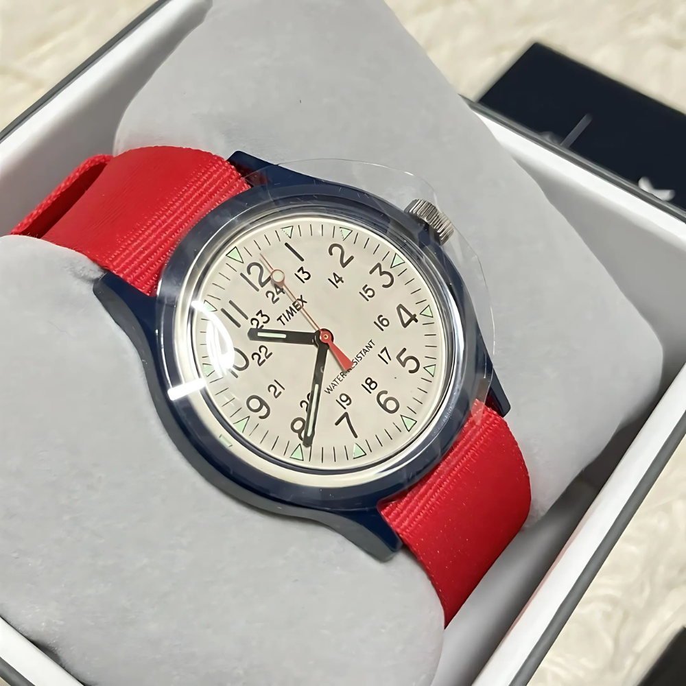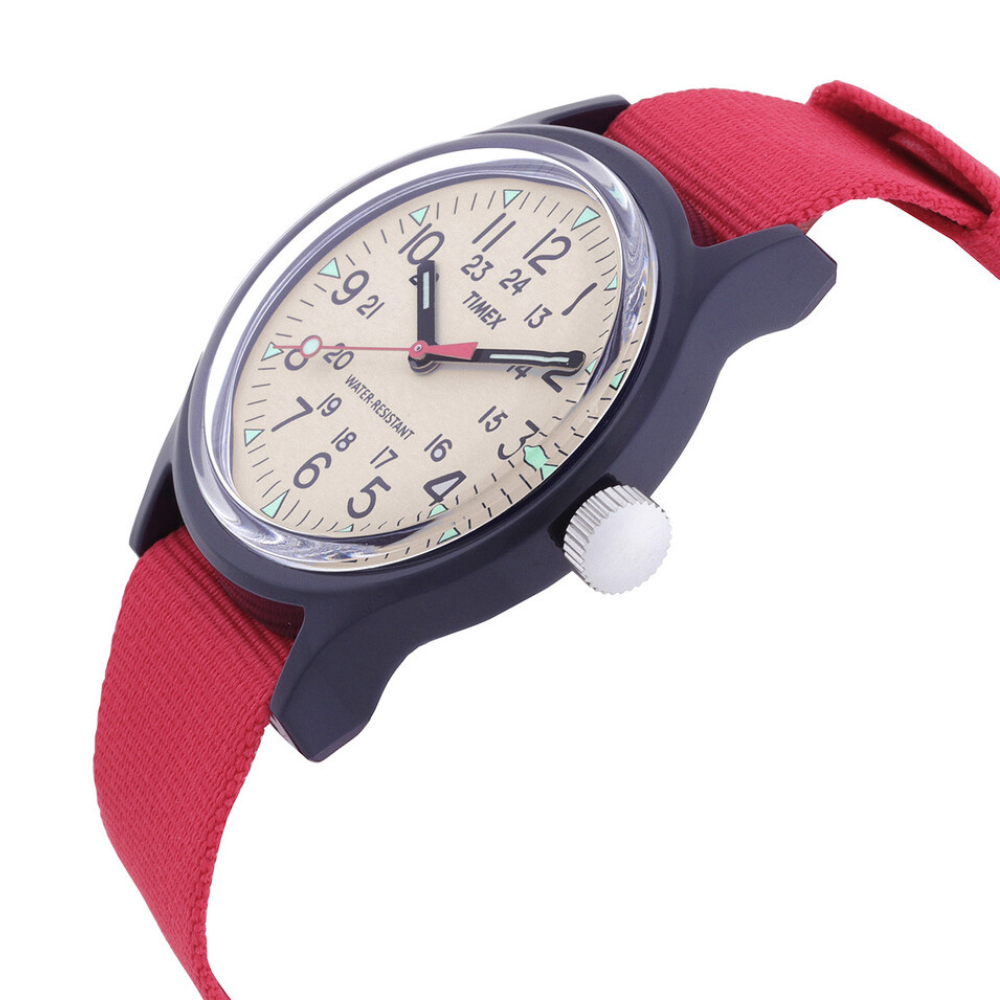 ساعة تايمكس أورجينال كامبر كوارتز النسائية تجمع بين البساطة الكلاسيكية والعملية اليومية. ميناء كريمي بأرقام واضحة يوفر قراءة سهلة للوقت، فيما يمنحها الهيكل خفيف الوزن وسوار النايلون الأحمر المريح لمسة من الحيوية تناسب الإطلالة الكاجوال والمغامرات اليومية❤