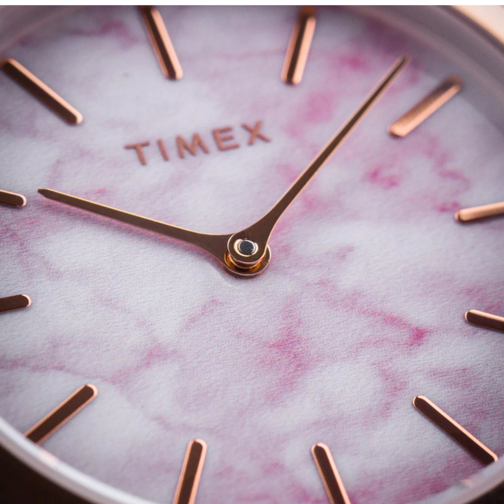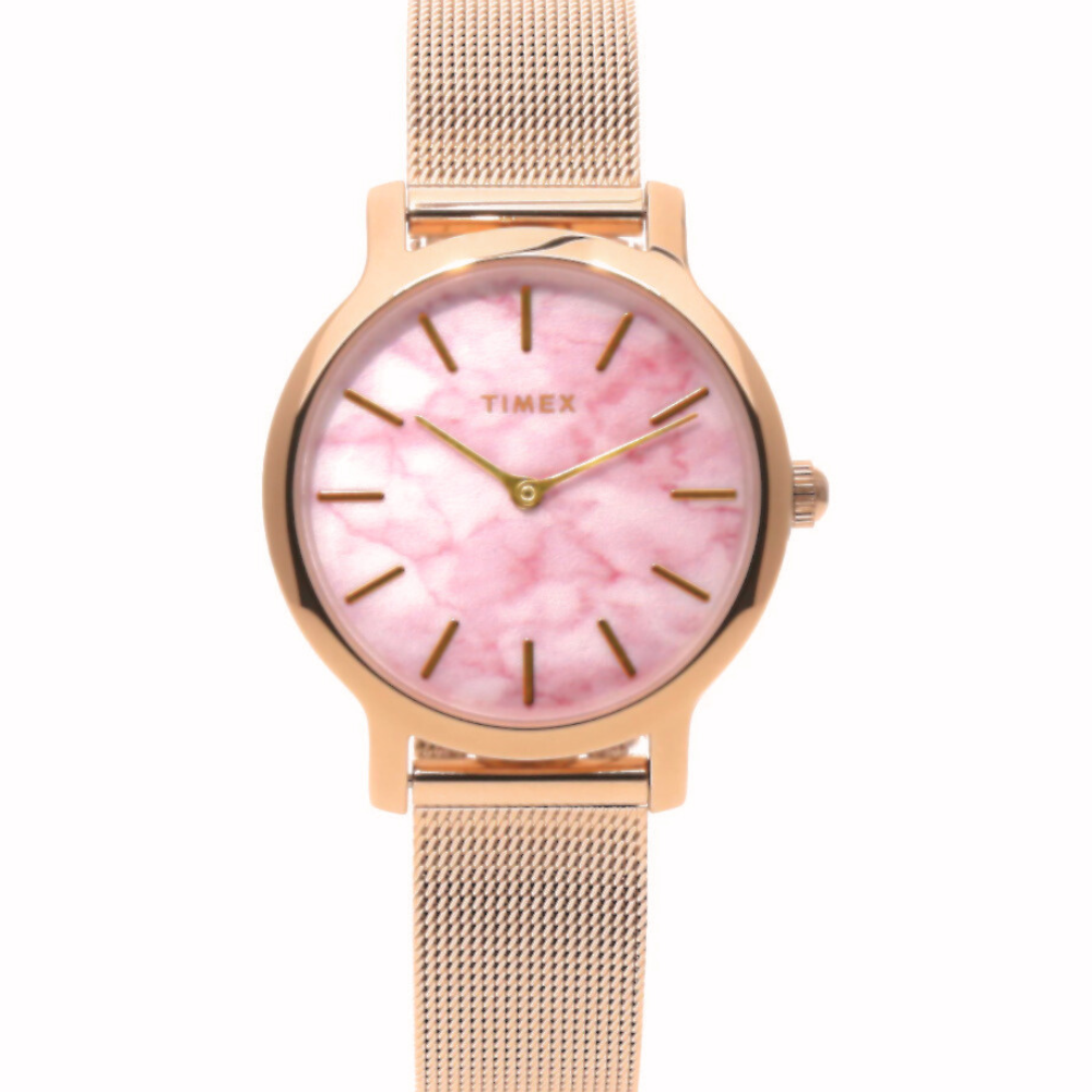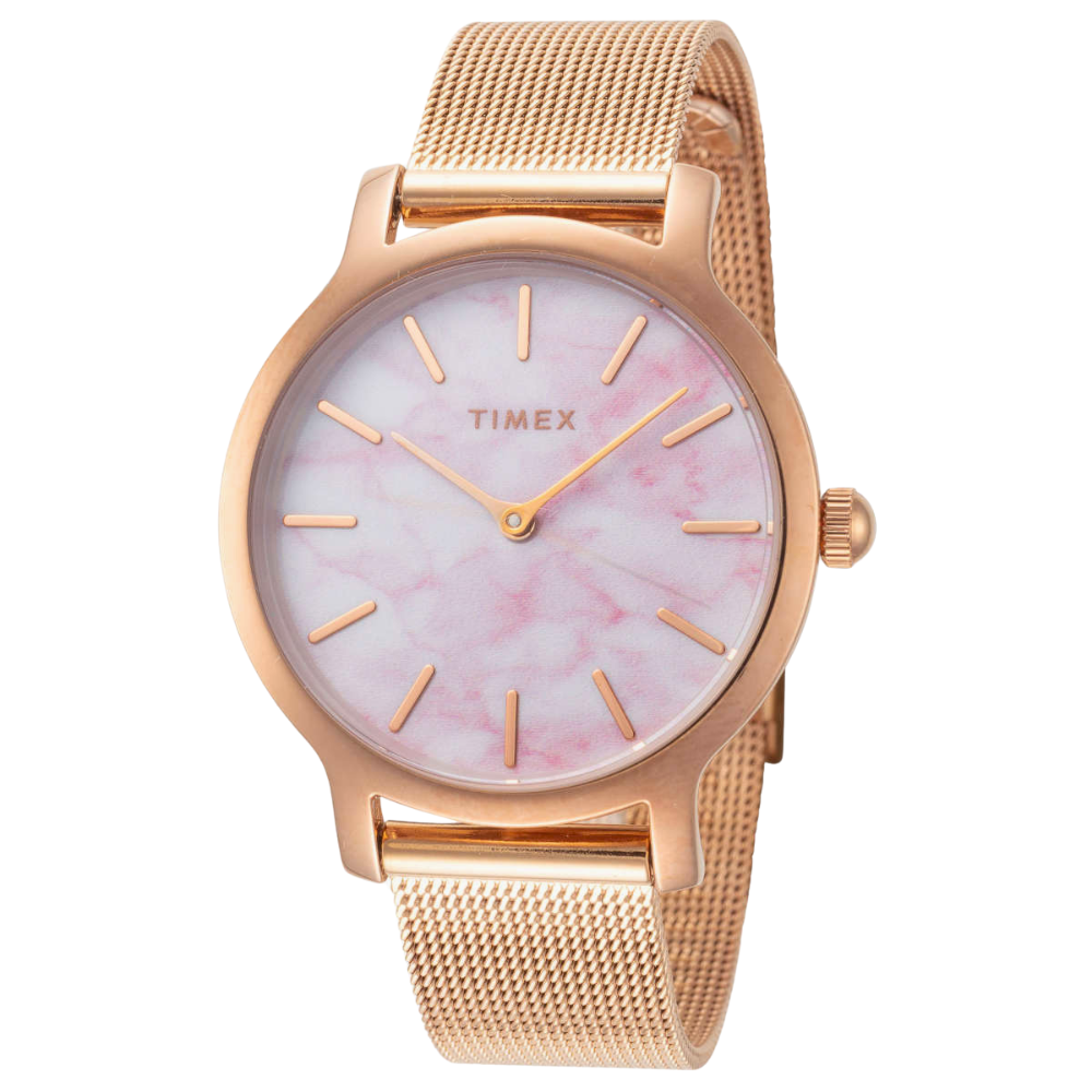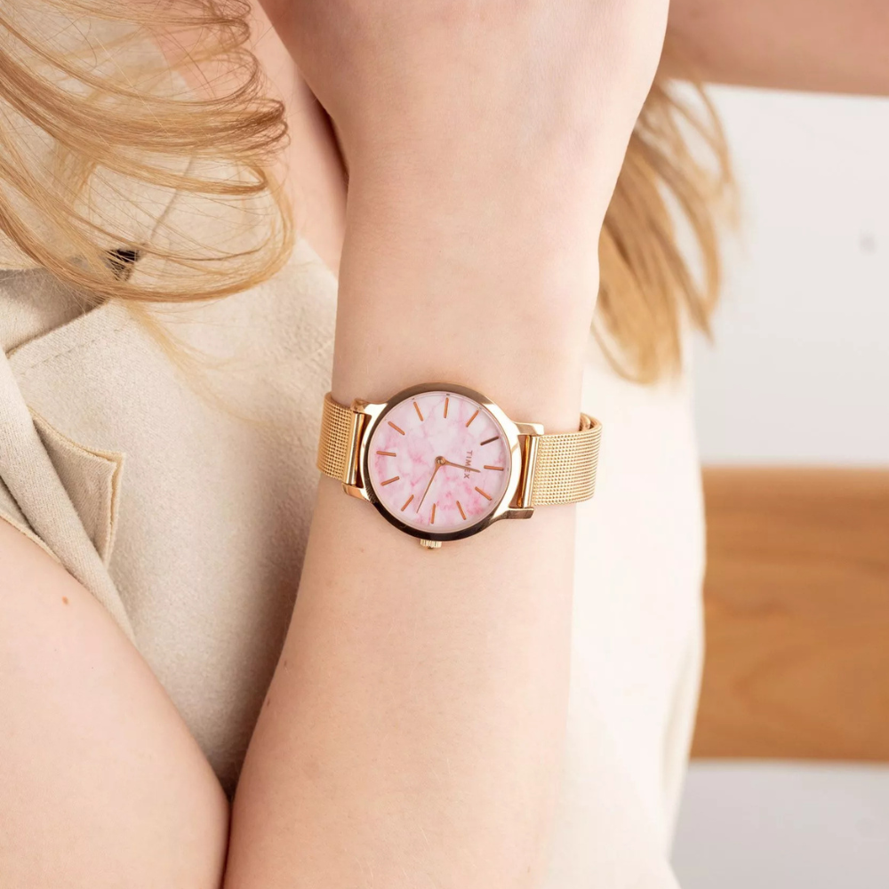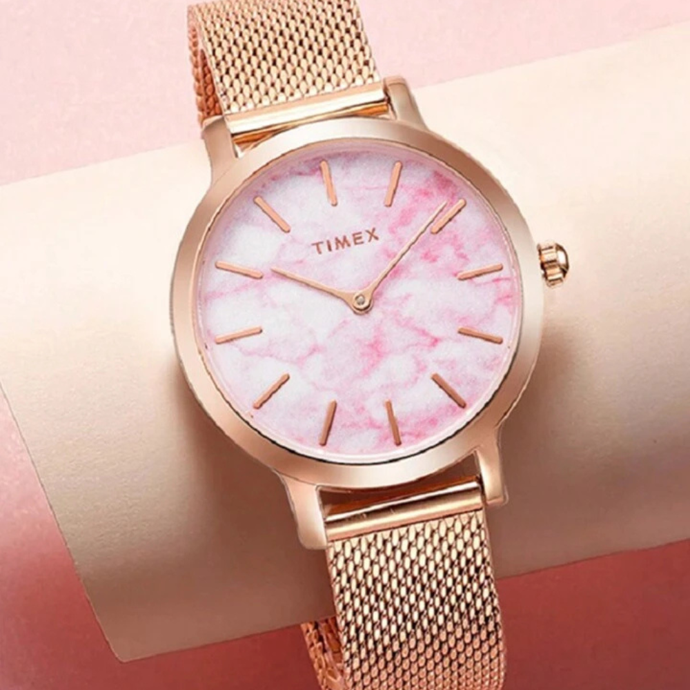 تجمع ساعة تايمكس تريند كوارتز النسائية بين الأنوثة الراقية والتصميم العصري لتضفي لمسة من الفخامة على معصمك. يتميز ميناؤها الرخامي الوردي بطابع فريد يعكس الأناقة والرقي، ويكتمل بإطار من الستانلس ستيل بلون ذهبي وردي يعزز جمالها. الهيكل يمنحك مظهرًا أنيقًا وخفيف الوزن يناسب مختلف الإطلالات. أما السوار الشبكي المصنوع من الستانلس ستيل، فيوفر راحة وتألقًا لا مثيل له 🤍